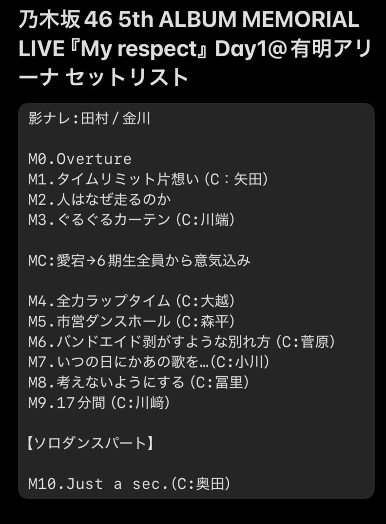 そういえばMy respectは一度もオリメン全員参加で披露できなかった楽曲になっちゃったか、まぁ体調不良は仕方なし