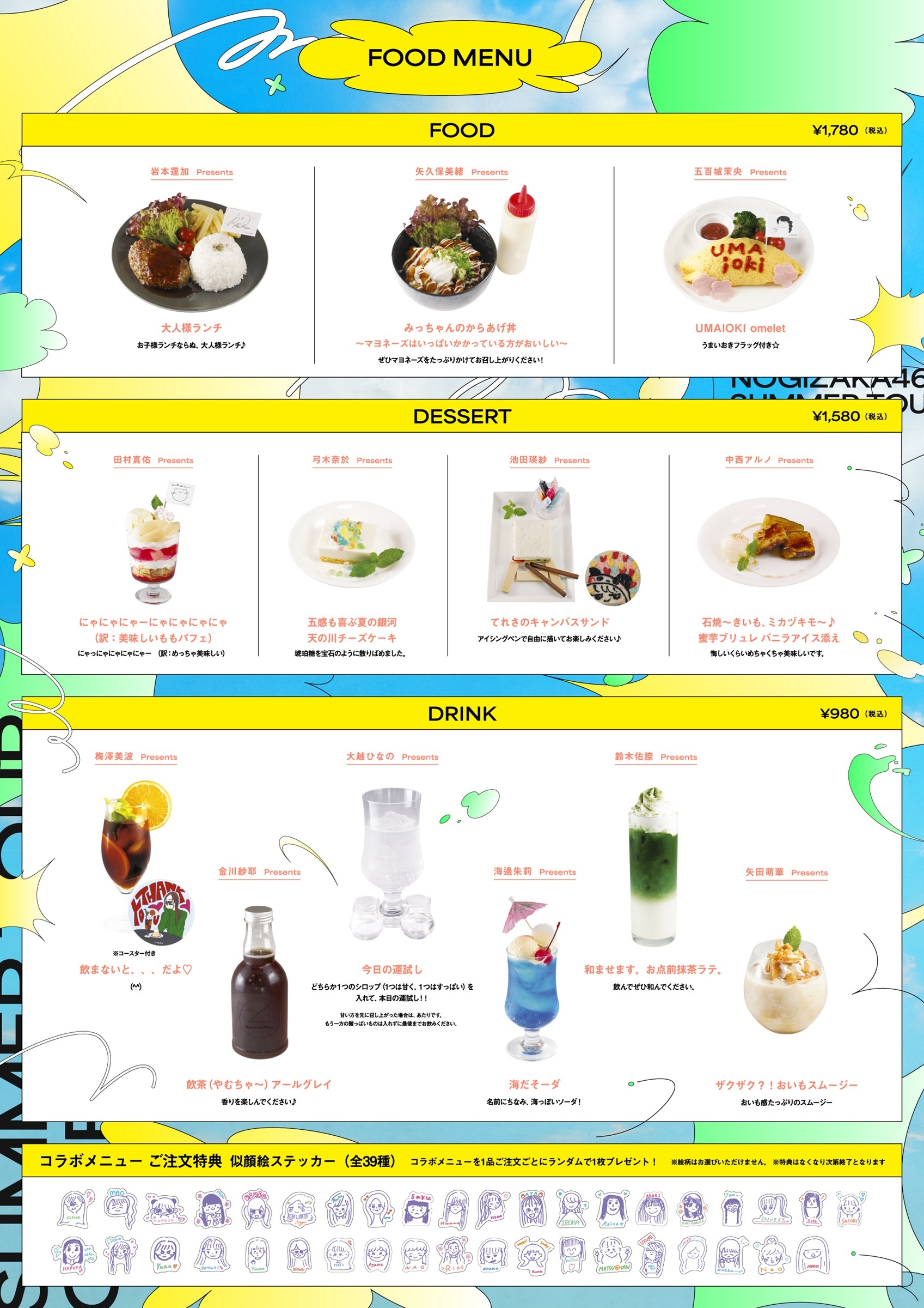 真夏の全国ツアーカフェ2025の前期メニューはこちら! <フード>岩本蓮加:大人様ランチ矢久保美緒:みっちゃんのからあげ丼 〜マヨネーズはいっぱいかかっている方がおいしい~五百城茉央:UMAIOKI omelet <デザート>田村真佑:にゃにゃにゃーにゃにゃに